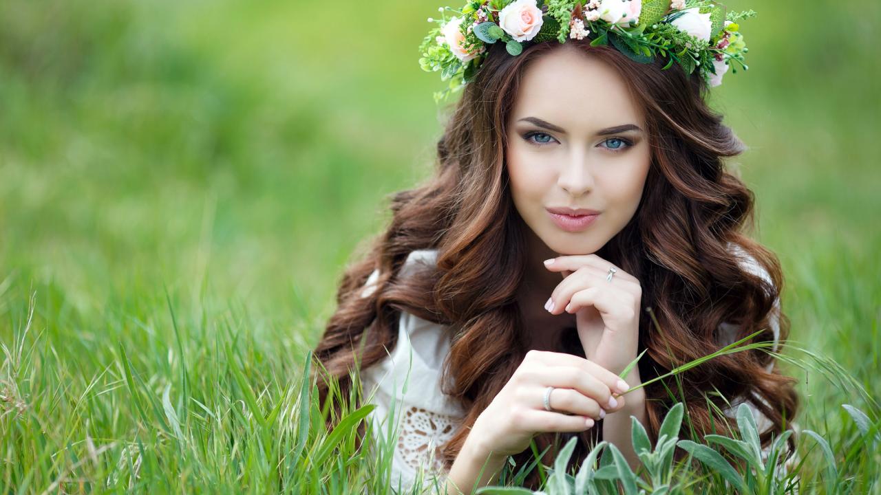 Wallpaper A girl with beautiful long hair lies on the grass