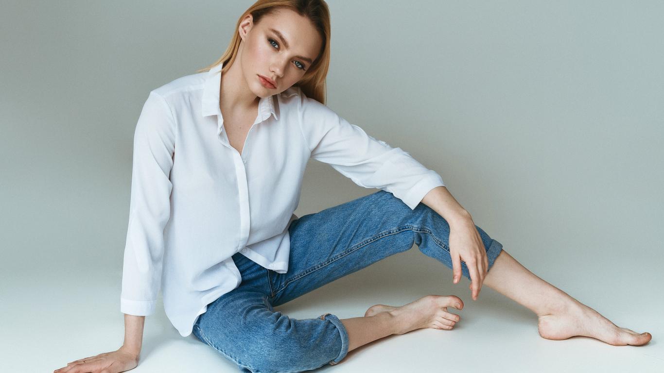 Wallpaper Beautiful girl in a white shirt on a gray background