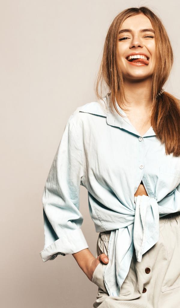 Wallpaper Funny girl in a shirt with sticking out tongue
