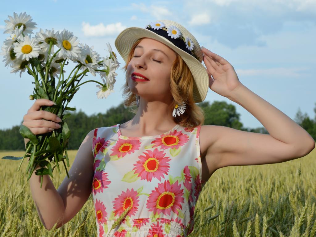 Wallpaper Beautiful girl with a bouquet of daisies in her hand