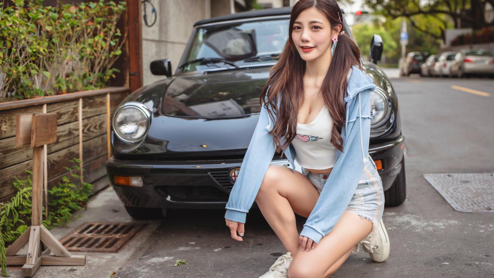 Wallpaper Asian girl sitting near the car