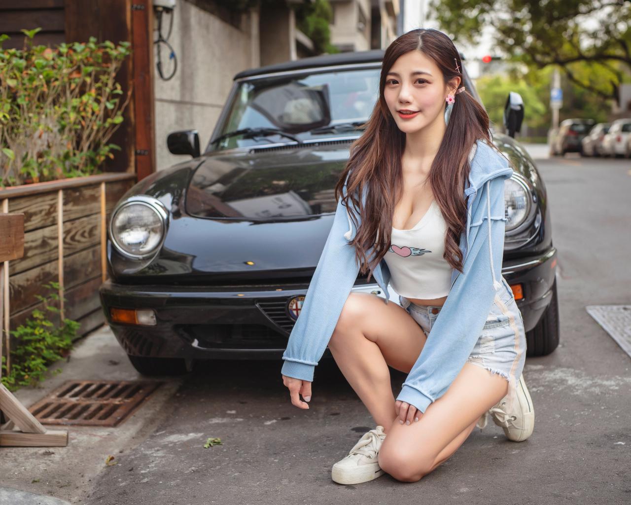 Wallpaper Asian girl sitting with flowers on the floor by the window