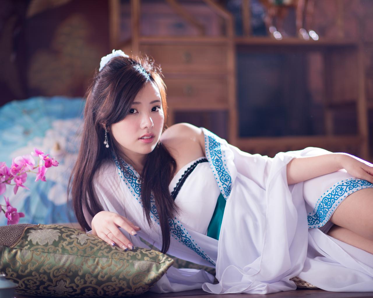 Wallpaper Asian girl in a beautiful dress lies on the bed
