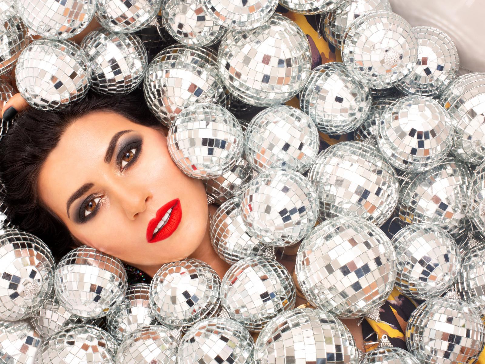 Wallpaper Young girl strewn with shiny balloons