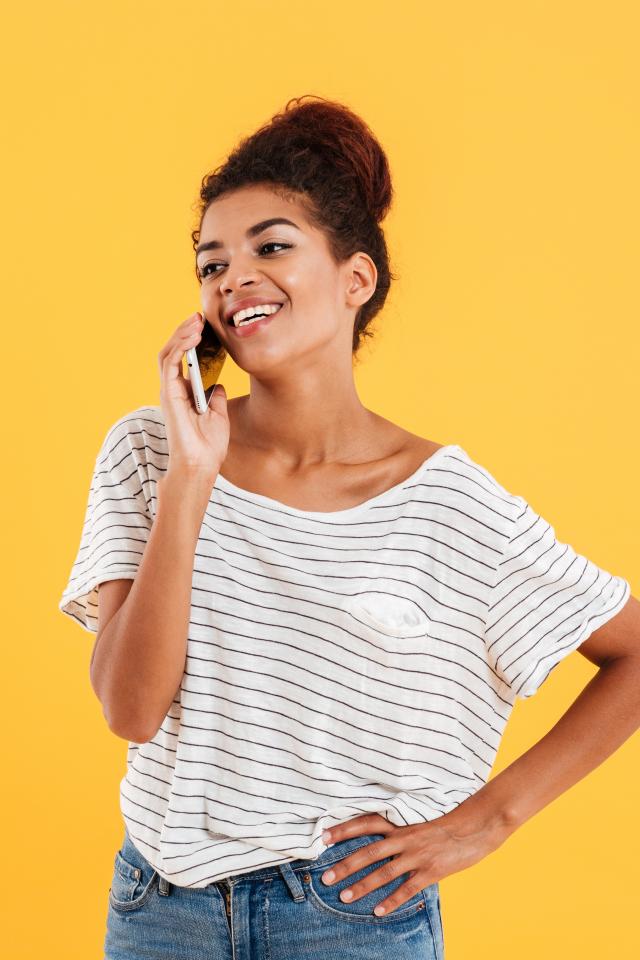 Wallpaper Beautiful girl with smartphone on yellow background