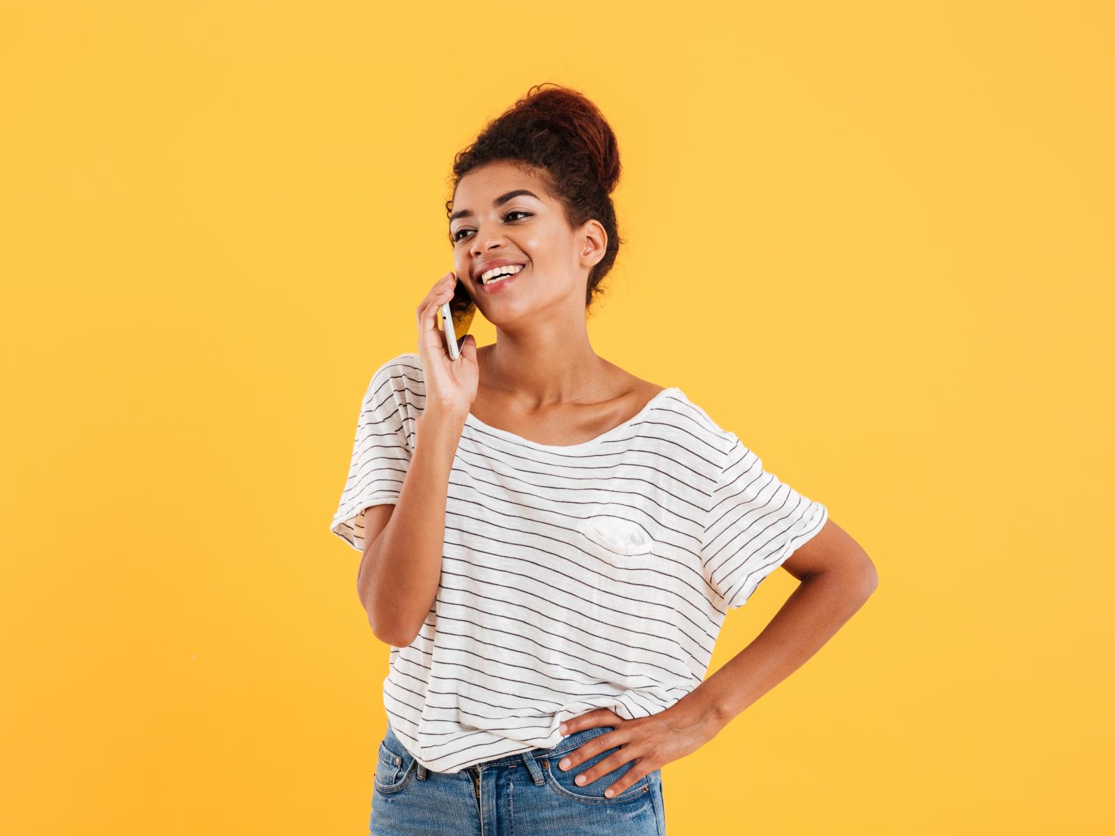 Wallpaper Beautiful girl with smartphone on yellow background