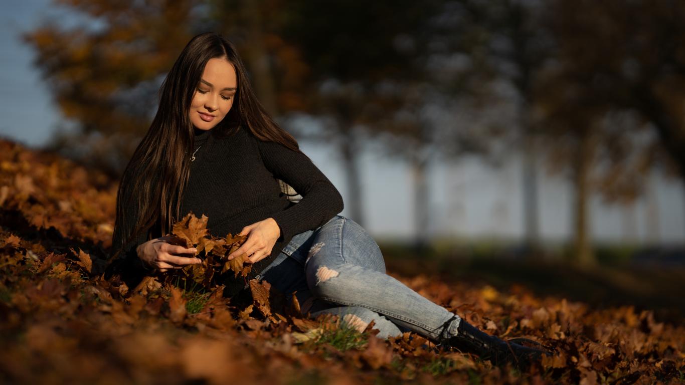 Wallpaper Smiling girl model lies on the ground with fallen leaves