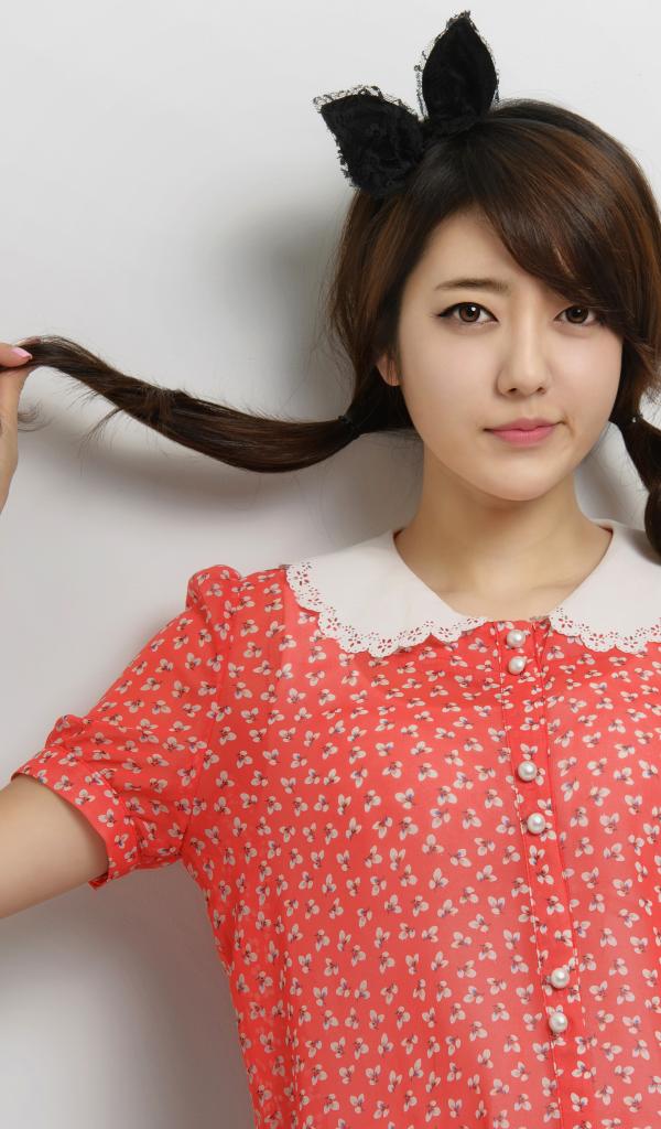 Wallpaper Asian girl in a dress stands against the wall