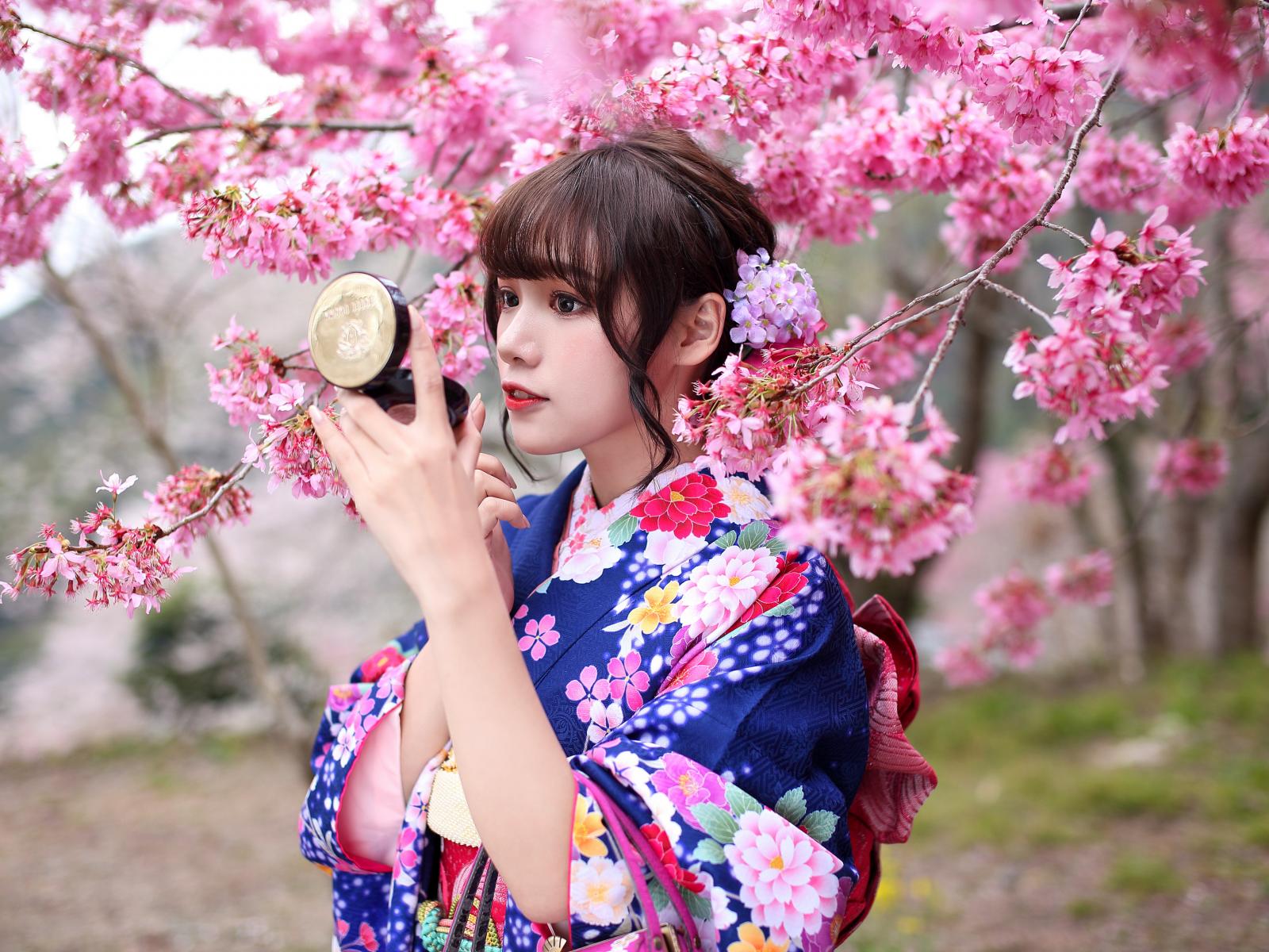 Wallpaper A girl in a kimono stands by a sakura bush