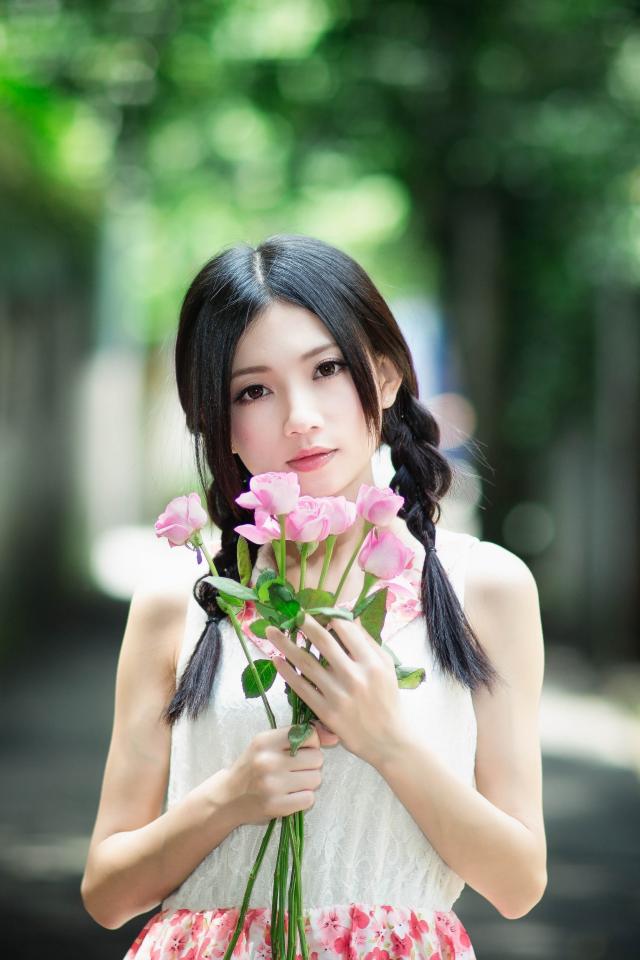 Wallpaper Cute asian girl with a bouquet of pink roses
