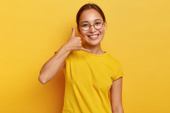 Wallpaper Smiling girl actress Dove Caron on a yellow background close-up