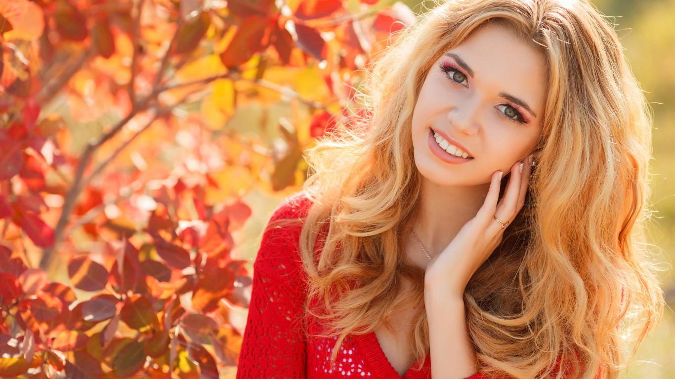 Wallpaper Beautiful blonde in a red sweater outdoors in autumn