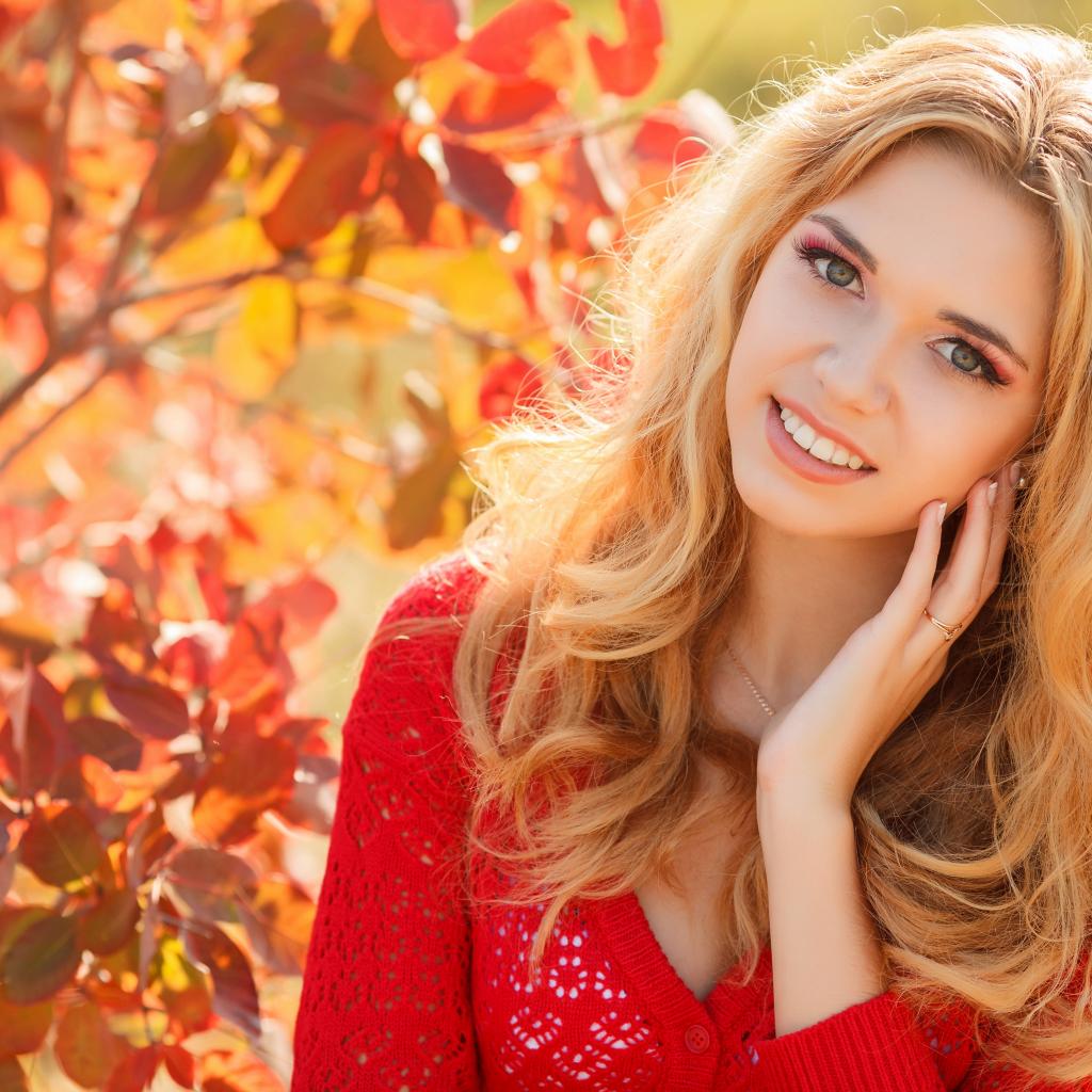 Wallpaper Beautiful blonde in a red sweater outdoors in autumn