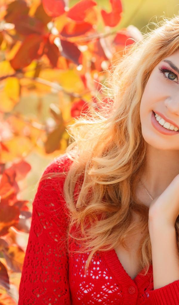 Wallpaper Beautiful blonde in a red sweater outdoors in autumn