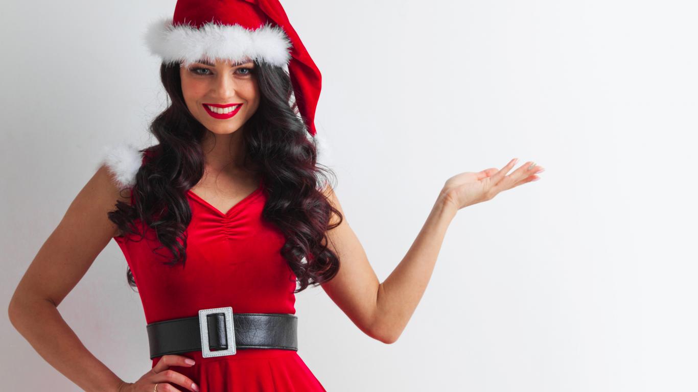 Wallpaper Smiling girl in christmas costume on gray background