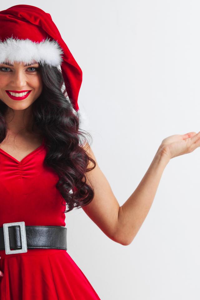 Wallpaper Smiling girl in christmas costume on gray background