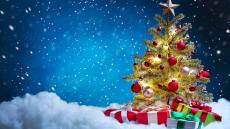 Wallpaper Beautiful girl looking at gifts by the Christmas tree