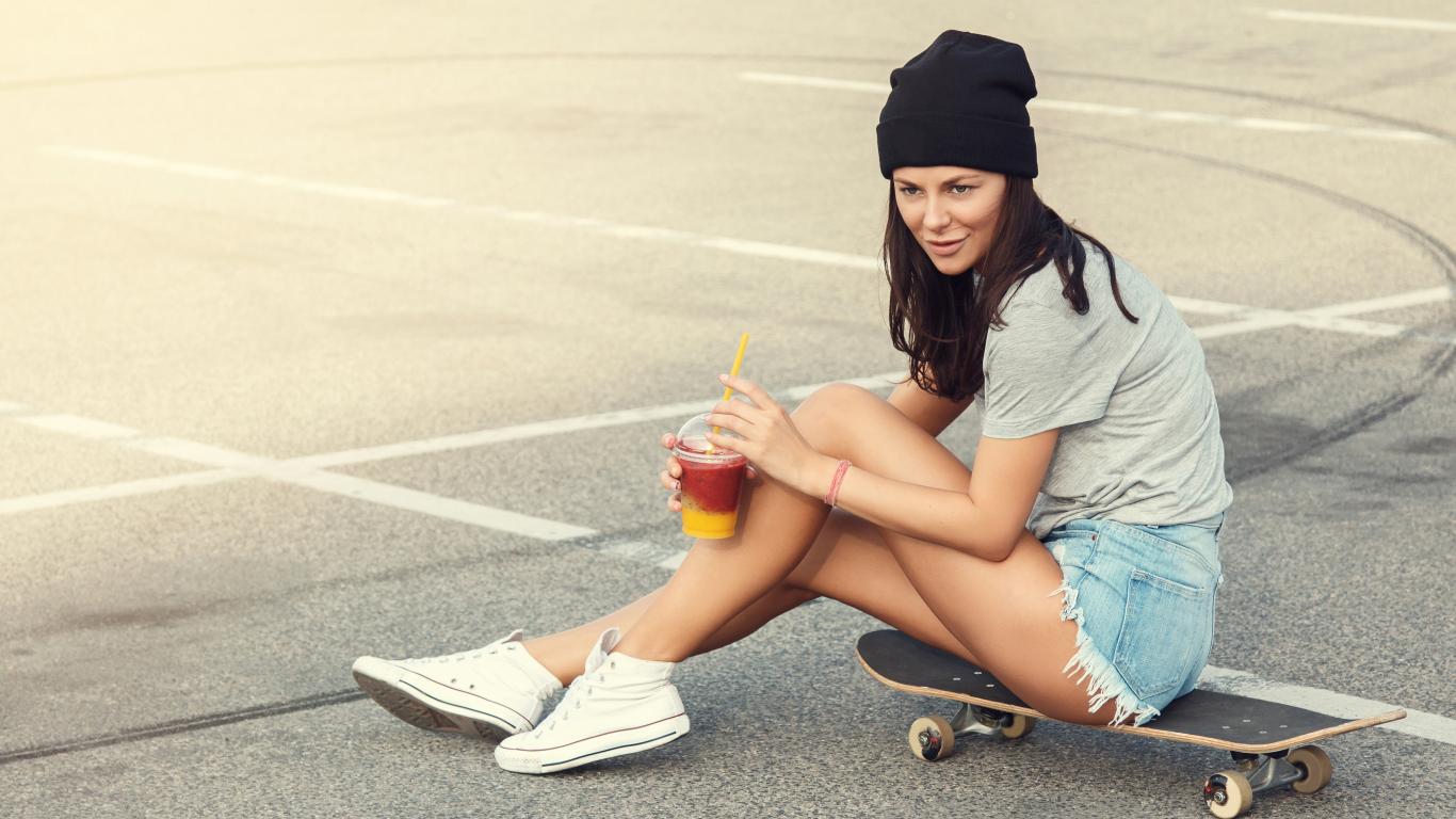 Wallpaper A girl in sunglasses is sitting on a skateboard