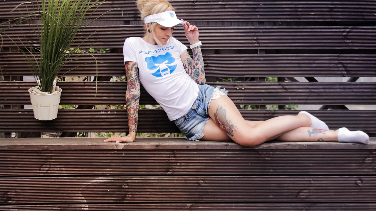 Wallpaper Sports girl in tattoos lies on a wooden bench