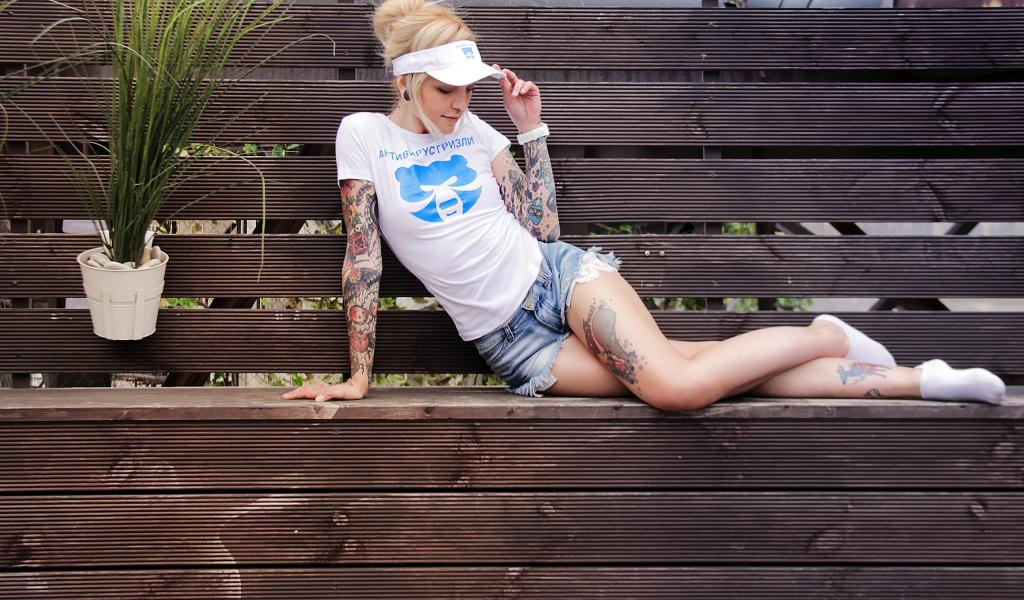 Wallpaper Sports girl in tattoos lies on a wooden bench