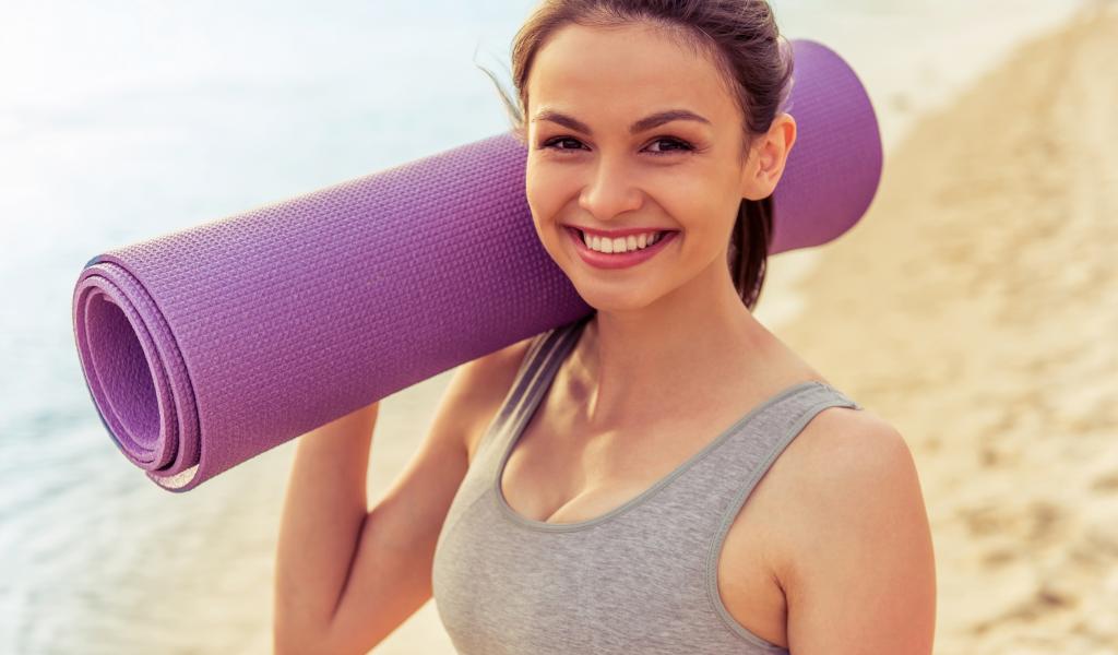 Wallpaper Sports girl with yoga mat on the beach