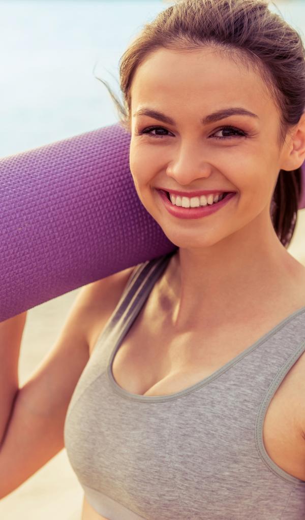 Wallpaper Sports girl with yoga mat on the beach