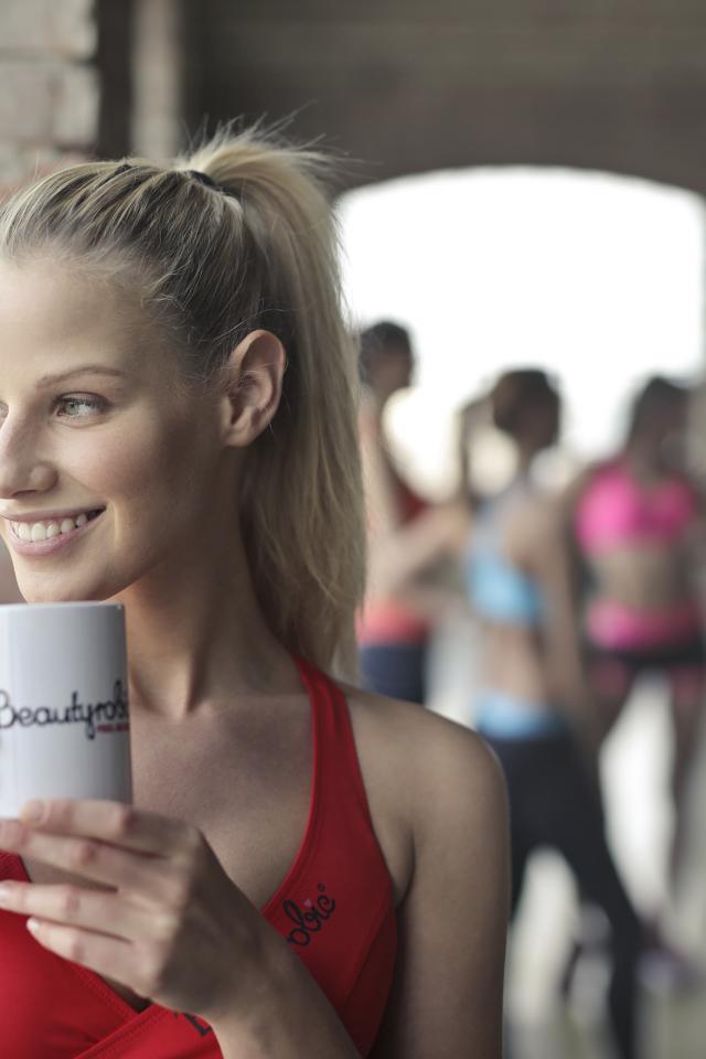 Wallpaper Smiling sporty girl with a cup of coffee by the window