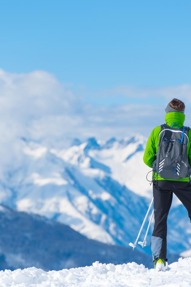 Wallpaper Skier in a snowy forest under a beautiful blue sky with white clouds