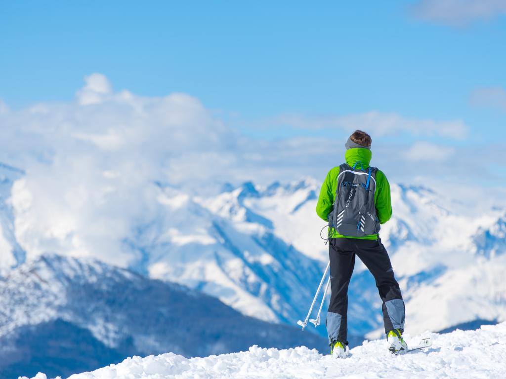 Wallpaper Skier in a snowy forest under a beautiful blue sky with white clouds