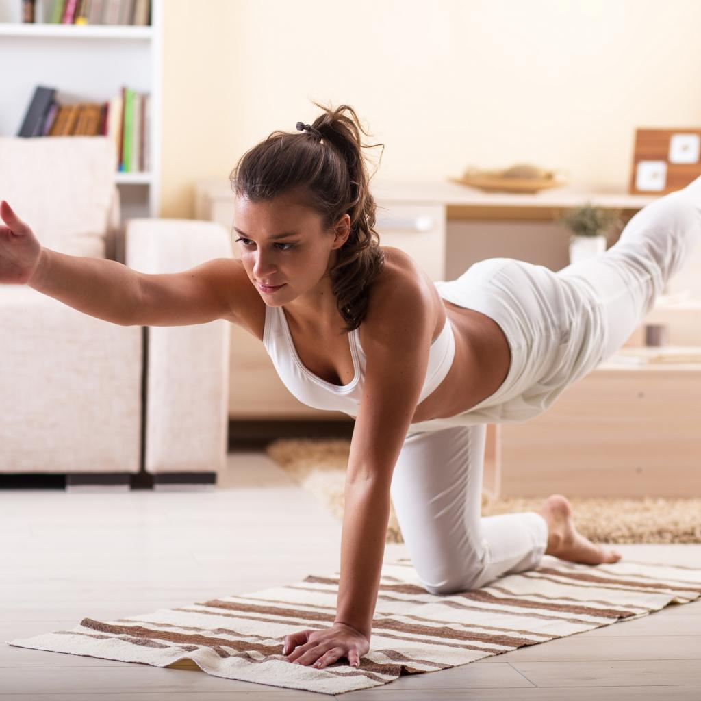 Wallpaper Beautiful girl in a white suit does fitness at home