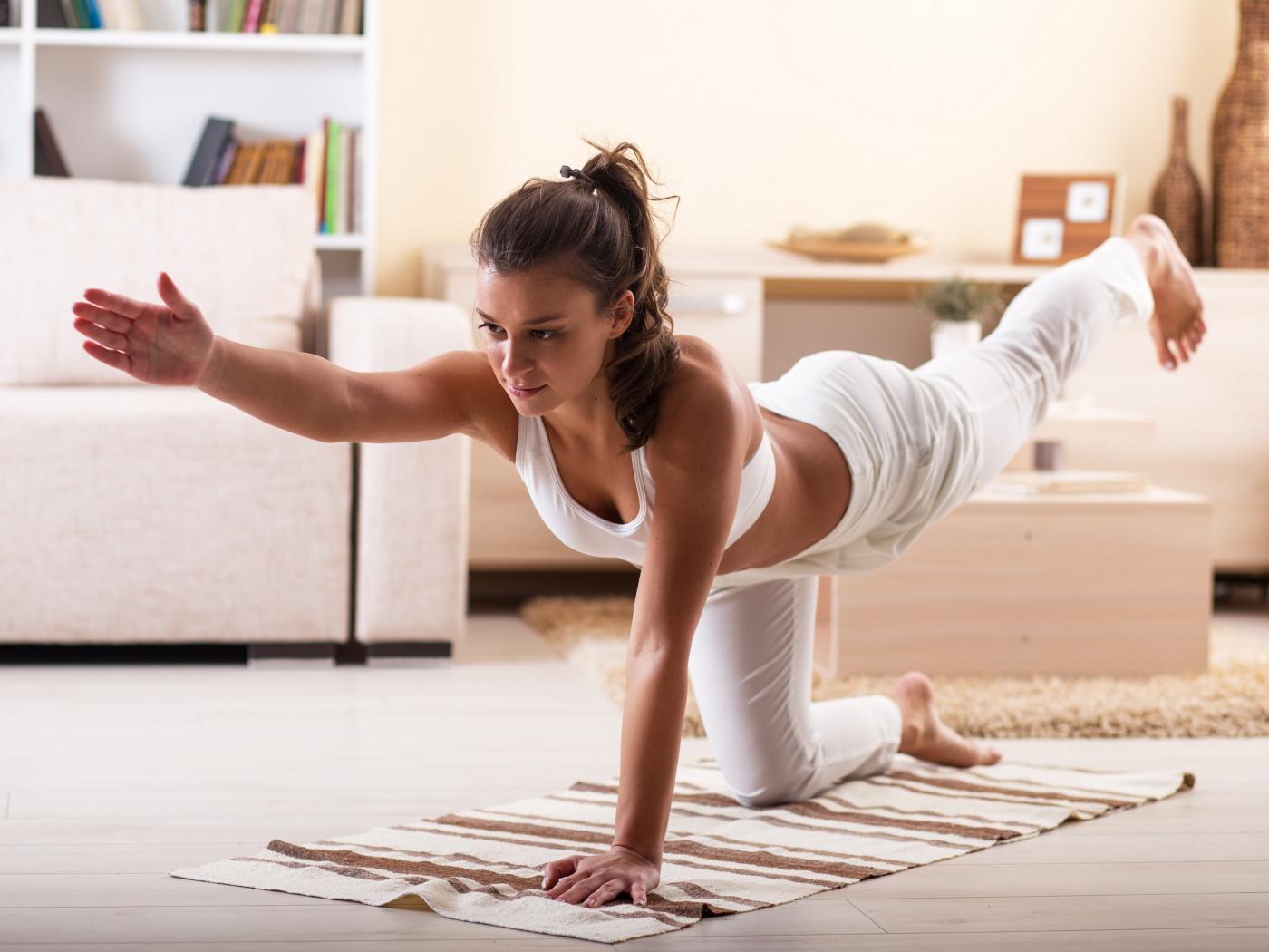 Wallpaper Beautiful girl in a white suit does fitness at home