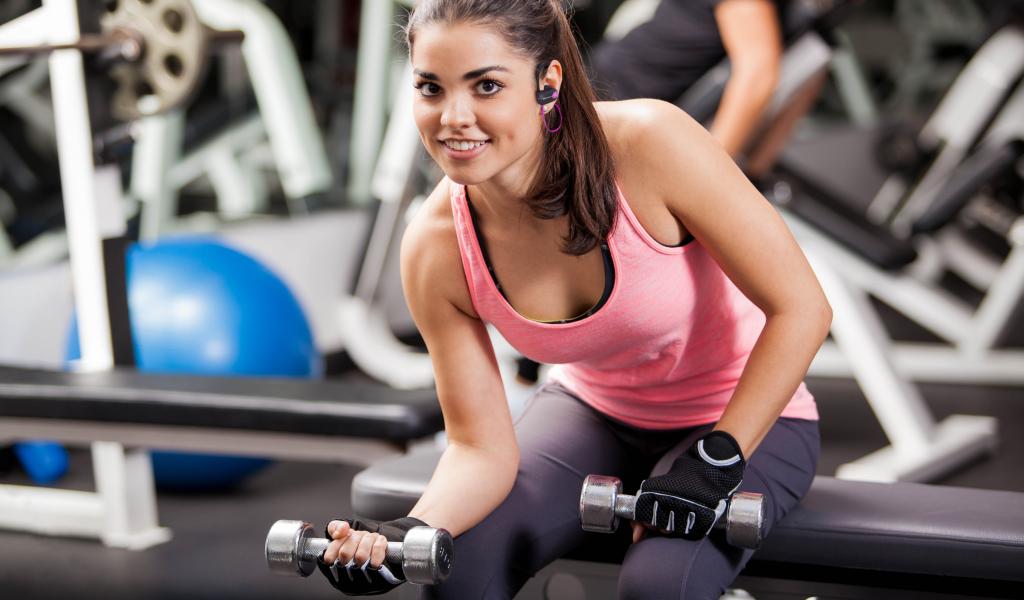 Wallpaper Smiling girl swinging dumbbells in the gym