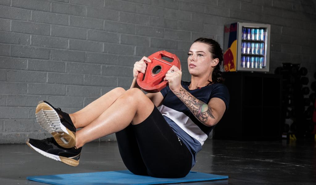 Wallpaper Strong girl with tattoos on her arm shakes the press