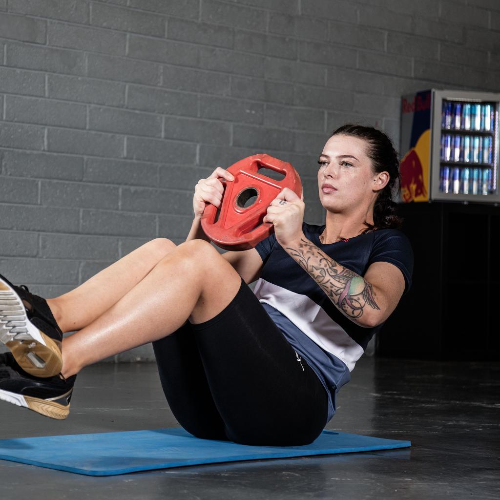 Wallpaper Strong girl with tattoos on her arm shakes the press