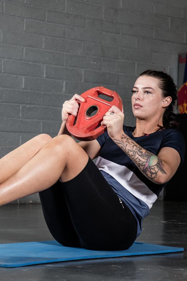 Wallpaper Strong girl with tattoos on her arm shakes the press