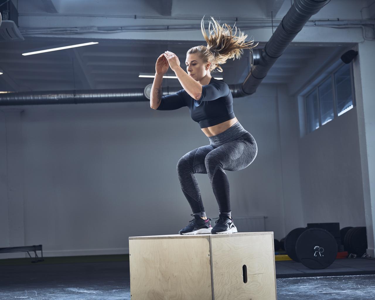 Wallpaper Athletic girl jumps on a curbstone in a gym
