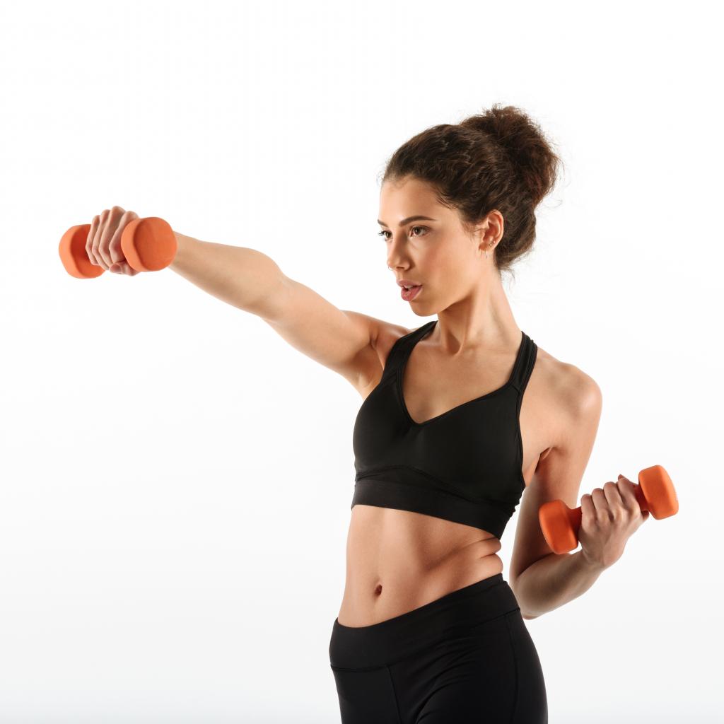 Wallpaper Girl in a black suit shakes her arms with dumbbells