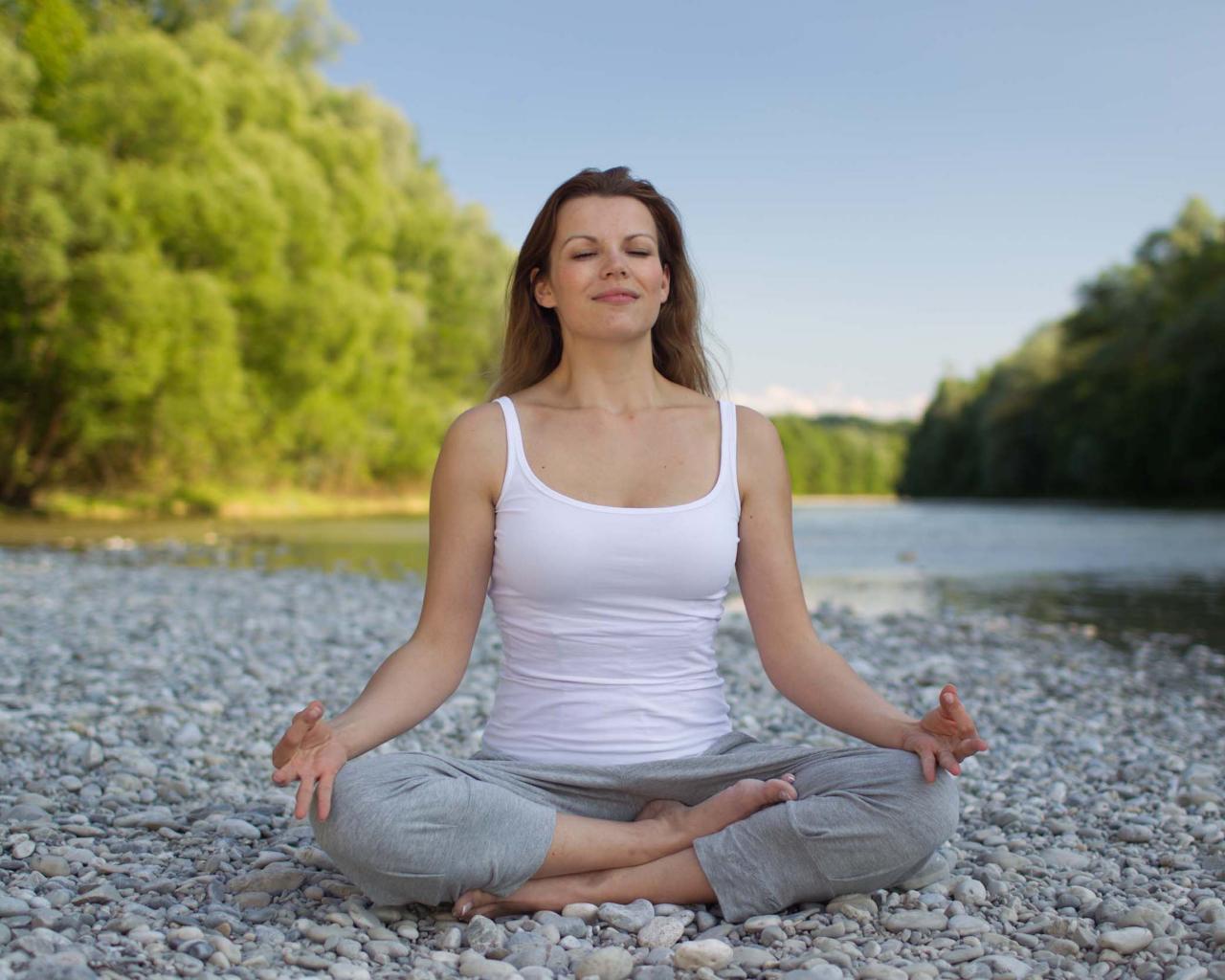 Wallpaper Girl in lotus position meditates by the river