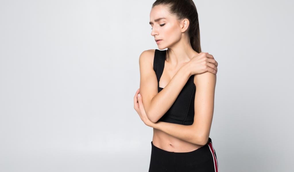 Wallpaper Modest sports girl on a gray background