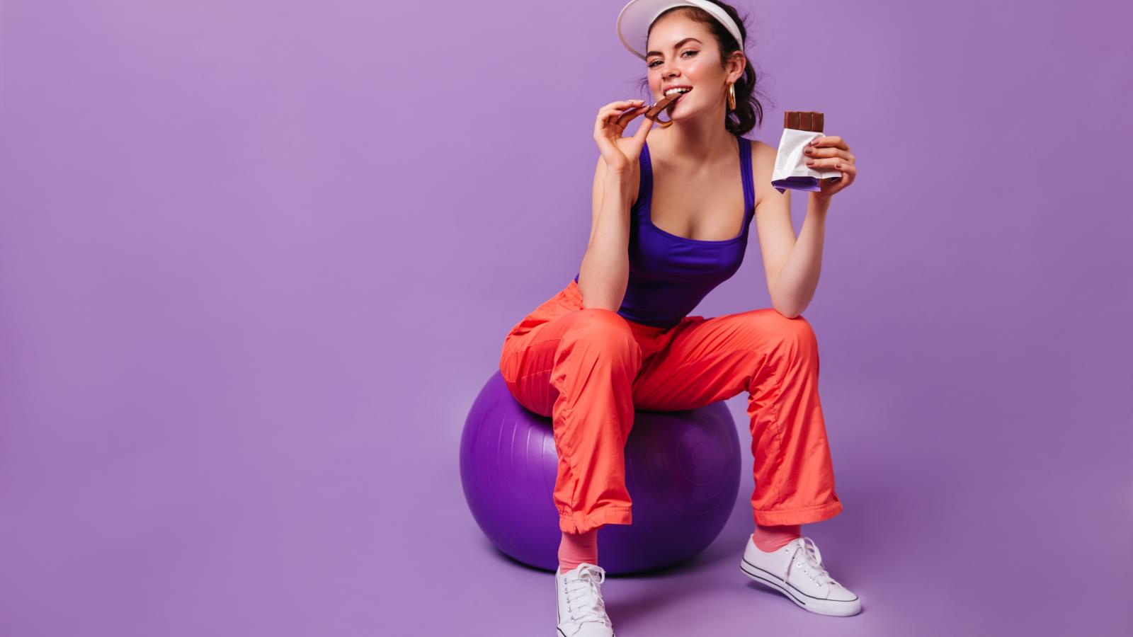 Wallpaper Girl with chocolate bar sitting on fitball