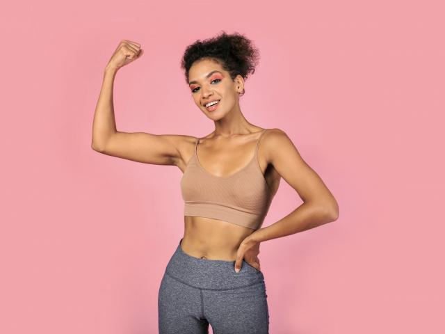 Wallpaper Sporty girl doing stretching on a gray wall background