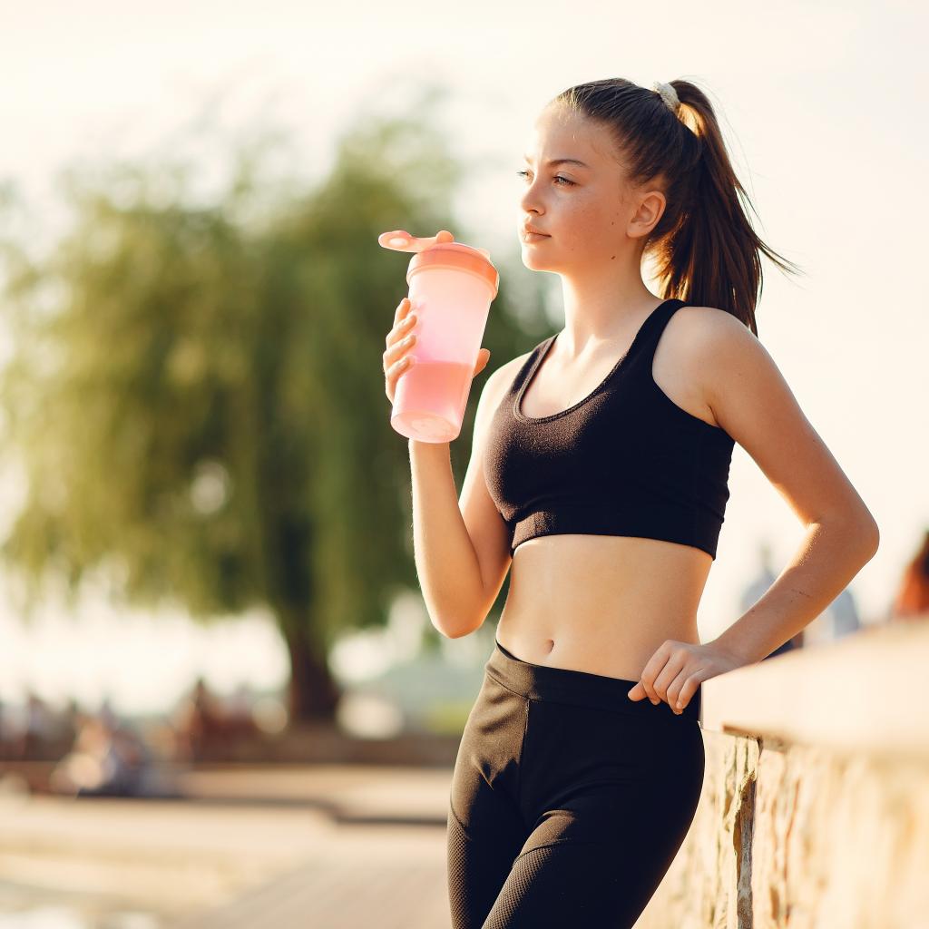Wallpaper Beautiful sports girl drinks water on a gray background