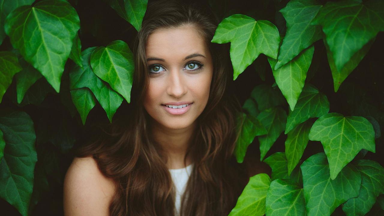 Wallpaper Green-eyed girl model among leaves