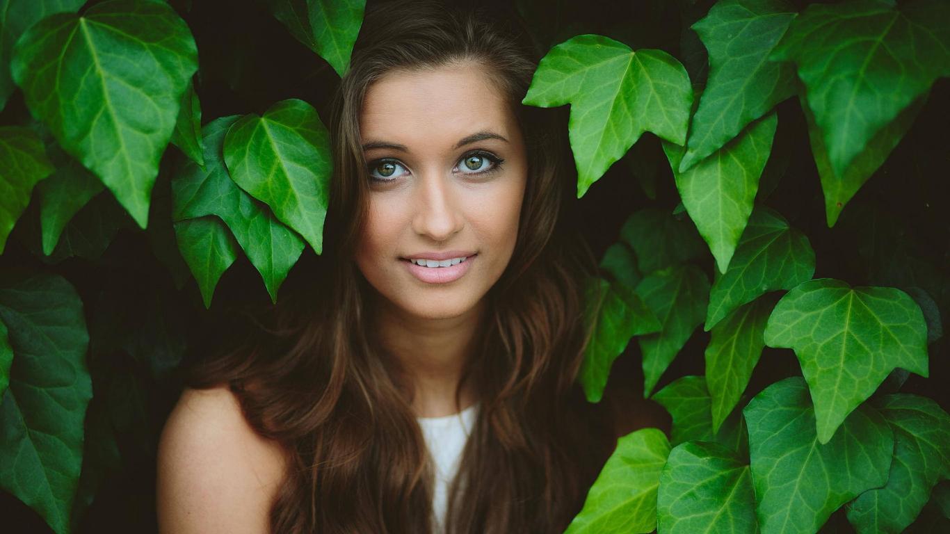 Wallpaper The face of a beautiful blue-eyed girl is decorated with green leaves