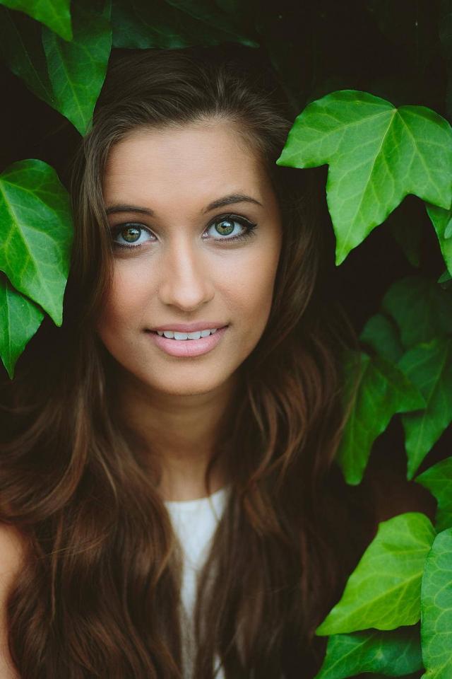 Wallpaper Green-eyed girl model among leaves