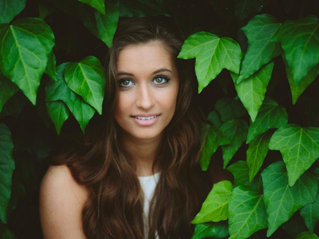 Wallpaper Green-eyed girl model among leaves