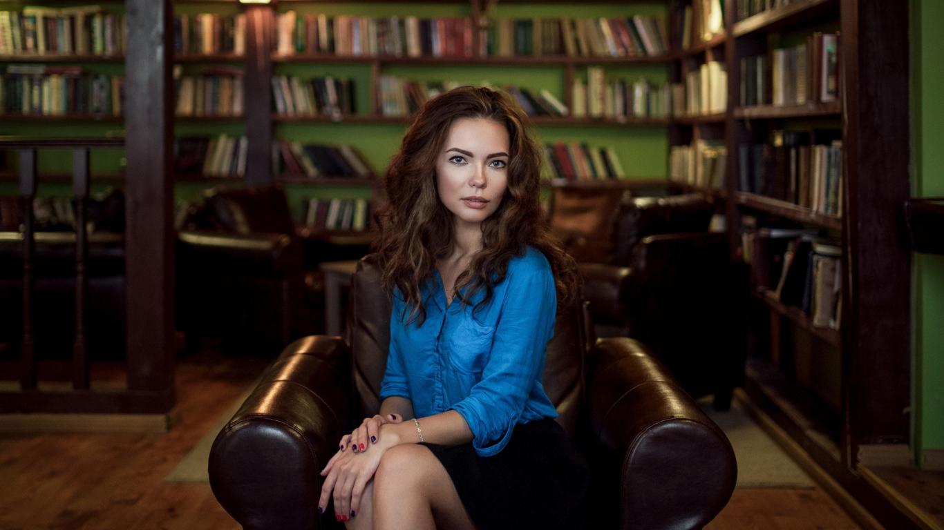 Wallpaper Model in blue blouse sitting on a leather chair