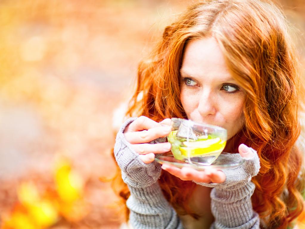 Wallpaper Red-haired girl model with a cup of green tea