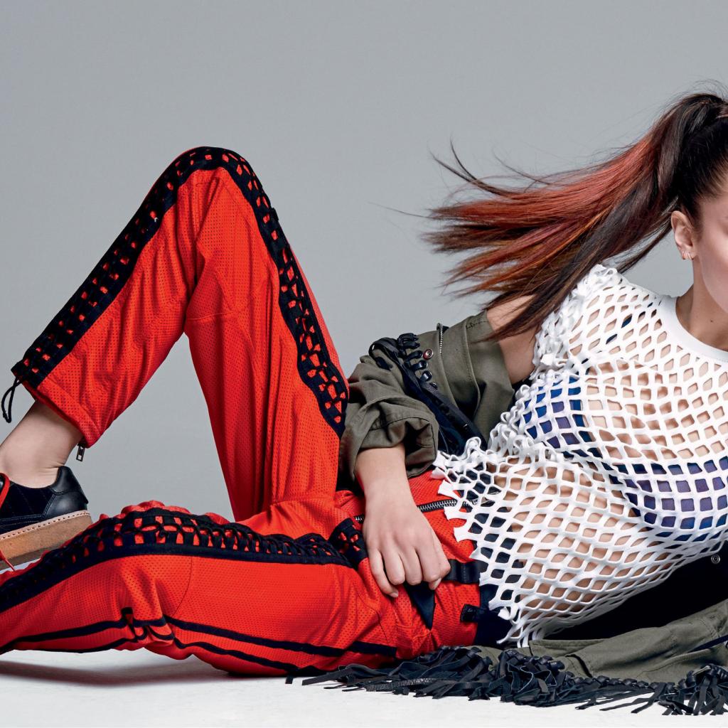 Wallpaper American model Bella Hadid in a suit on a gray background