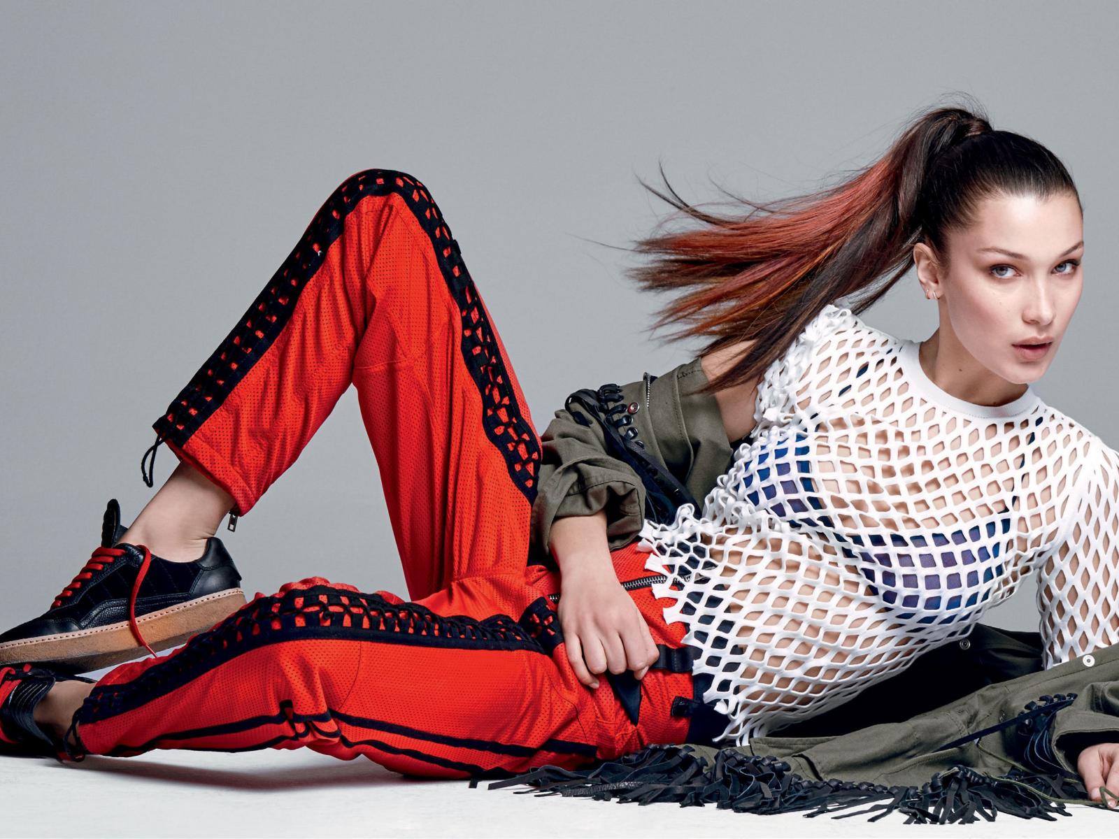 Wallpaper American model Bella Hadid in a suit on a gray background